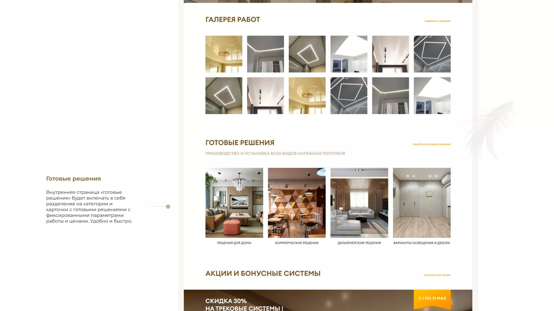 Что мы сделали. Разработали сайт в теплых и уютных «шоколадных» тонах. Продумали структуру, наполнили ее удобными разделами такими как «готовые решения», которые включают в себя не только уже готовые варианты с фиксированной ценой, но и разделение по категориям: решения для дома, коммерческих помещений, интересные дизайнерские решения. Так же предложили клиенту онлайн-калькулятор, что может существенно упростить потенциальным заказчикам нашего клиента в Красноармейске заказ потолков.