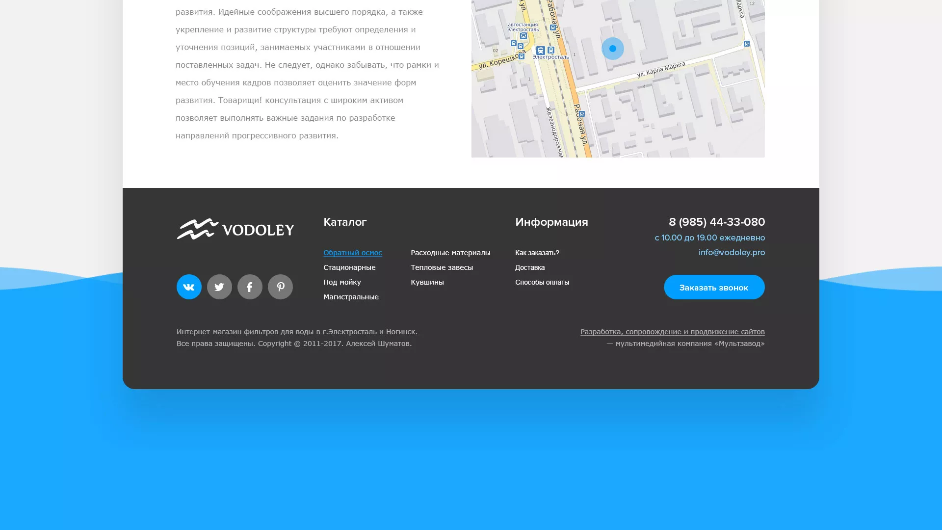 Работать с компанией «Мультзавод» удобно и легко, поэтому, если Вам требуется создание аналогичного сайта по продаже и установке фильтров очистных сооружений в Красноармейске, мы предложим Вам действительно выгодные цены и удобные условия сотрудничества. Мы обещаем, что вложенные в разработку сайта деньги окупятся и Вы получите современный рабочий интернет-магазин!